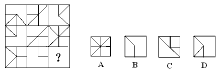 (解答:每行前兩個(gè)圖形疊加后,不同的部分就是第三個(gè)圖形。正確答案是D。)