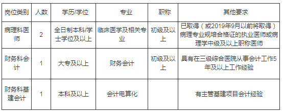 根據(jù)醫(yī)院工作需要,招聘病理科醫(yī)師、財務(wù)科會計等崗位工作人員共4人,具體條件如下: