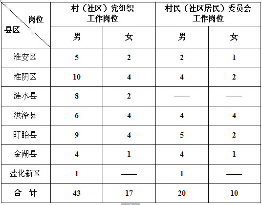 全市選聘到村(社區(qū))任職高校畢業(yè)生90名,其中淮安區(qū)10名、淮陰區(qū)20名、漣水縣10名、洪澤縣18名、盱眙縣20名、金湖縣10名,淮安鹽化新材料產業(yè)園區(qū)2名(以下簡稱鹽化新區(qū)),具體崗位要求如下: