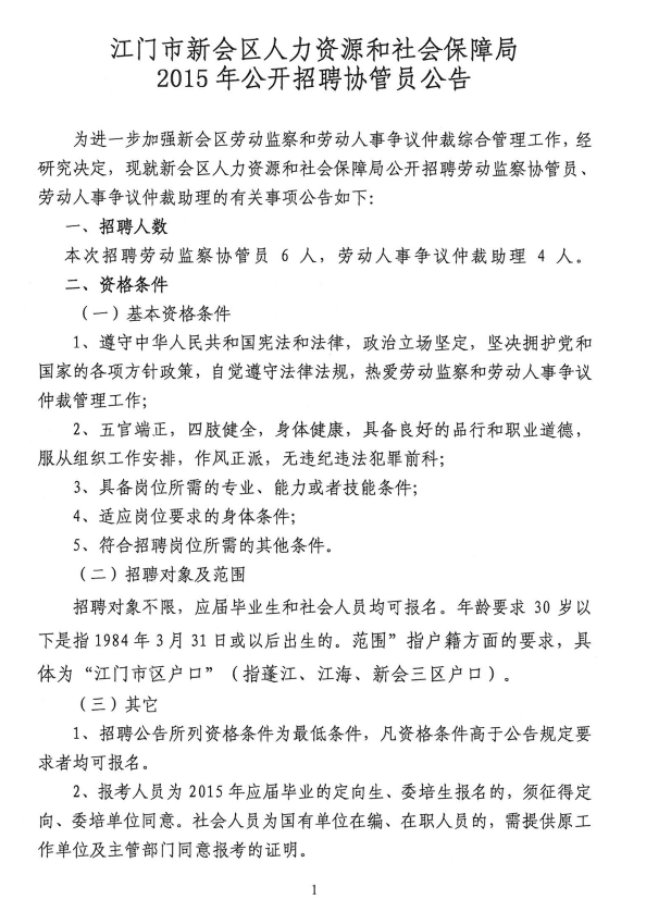 2015年廣東省江門市新會(huì)區(qū)人力資源和社會(huì)局招聘協(xié)管員10人公告