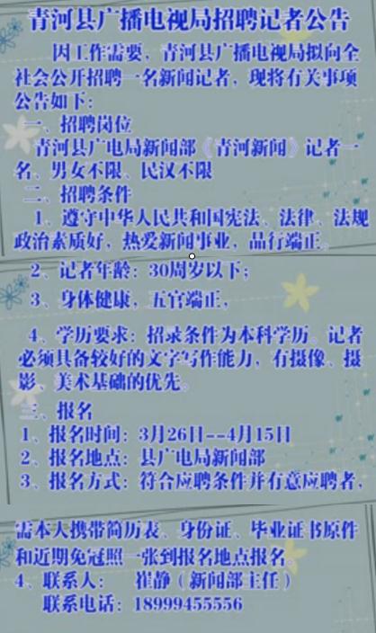 2015年新疆青河縣廣電局招聘記者公告【1人】