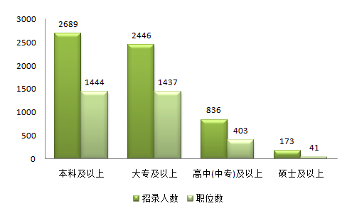 學(xué)歷要求是招錄公務(wù)員的硬性條件之一,是一道“硬門檻”,從整體來看,黑龍江公務(wù)員考試對(duì)學(xué)歷要求比較不算很高,要求以本科學(xué)歷為起點(diǎn)的招錄人數(shù)有2689人,1444個(gè)職位,要求以大專學(xué)歷為起點(diǎn)的招錄人數(shù)有2446人、1437個(gè)職位,基本持平。高中及中專為起點(diǎn)學(xué)歷的招錄人數(shù)為836人、403個(gè)職位,占總招錄人數(shù)的13.6%,主要集中在艱苦邊遠(yuǎn)地區(qū)的縣鄉(xiāng)級(jí)職位。