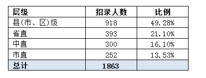 本次招錄涵蓋了各個層級,其中縣級占總?cè)藬?shù)比例,為49.28%,其次是省直機(jī)關(guān),招錄398人,占總?cè)藬?shù)的21.1%,國稅系統(tǒng)為國家垂直機(jī)構(gòu),招錄300人,占到總?cè)藬?shù)的16.1%,市級招錄規(guī)模最小,僅招252人,占到總?cè)藬?shù)的13.53%。從這些數(shù)據(jù)可以看出,縣級職位機(jī)會,有志在2016年成“公”的考生要認(rèn)真考慮縣級職位。