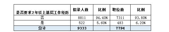 本次招錄對(duì)2年及以上基層工作經(jīng)歷的要求比較寬松,93.8%的職位無此類要求,客觀上拓寬了參加考試的人群,尤其是正在求職的應(yīng)屆畢業(yè)生,在參加招聘會(huì)的同時(shí)也可以選擇參加公務(wù)員考試增加就業(yè)機(jī)會(huì),有工作經(jīng)歷的考生要注意工作經(jīng)歷的計(jì)算時(shí)間截止為2016年3月21日。