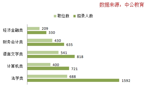 本次考試招錄囊括了理工科、文史類、藝術(shù)等各種專業(yè),涵蓋面廣,其中法學(xué)類、計算機類、語言文學(xué)類、財務(wù)會計類以及經(jīng)濟(jì)金融類專業(yè)最為“”,有688個職位需要法律類人才,總?cè)藬?shù)高達(dá)1592人,熱度之高令其他專業(yè)難以匹敵。