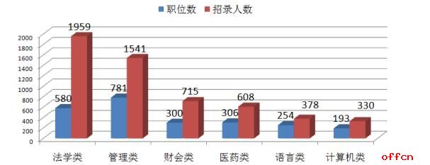 本次考試共有905個(gè)職位不限專業(yè),占總職位數(shù)的20%,與去年一樣。不限專業(yè)職位共招錄1709人,占總招錄人數(shù)的26%,略低于去年的30%。據(jù)中公網(wǎng)校統(tǒng)計(jì),本次考試最熱門的六大專業(yè)為法學(xué)類、管理類、財(cái)會類、醫(yī)藥類、語言類、計(jì)算機(jī)類。