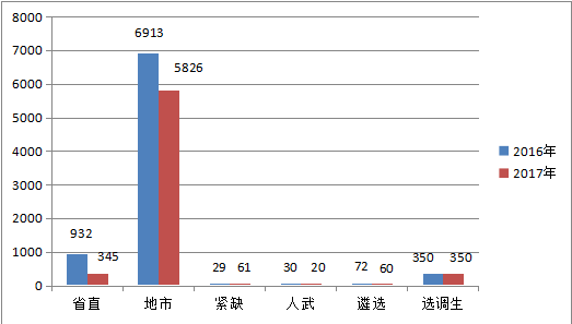 2017年浙江省公務(wù)員考試的招錄人數(shù)呈現(xiàn)遞減趨勢(shì),但是,今年也有增加,如殘疾人招錄人數(shù)增加、公務(wù)員遴選與省考同步進(jìn)行、選調(diào)生數(shù)量不變等等。具體如下圖: