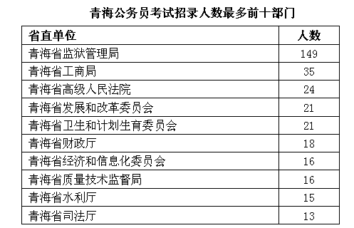 本次青海省共有43個省直部門面向社會公開招錄公務員,招錄人數(shù)大相徑庭,其中青海省監(jiān)獄管理局以招錄149人奪得第一寶座,達到位居第二的工商局的三倍之多,符合條件的考生們可以重點考慮一下這個部門。