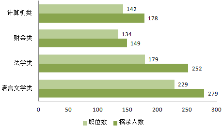 本次考試共有887個職位不限制專業(yè),占到總職位數(shù)的一半左右,說明報考條件正在放寬。語言類、法學(xué)類、財會類、計算機(jī)類是本次考試招錄的四大熱門專業(yè),其中語言文學(xué)類專業(yè)以279人、229個職位領(lǐng)先,成為本次招錄的“人氣”專業(yè)。