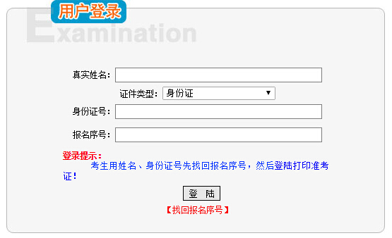 二、考生用姓名、身份證號先找回報(bào)名序號,然后登陸準(zhǔn)考證打印系統(tǒng)。