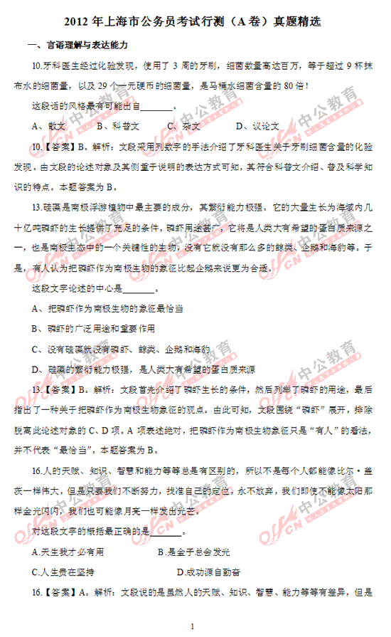 2012年上海市公務(wù)員考試行測(cè)(A卷)部分及答案解析